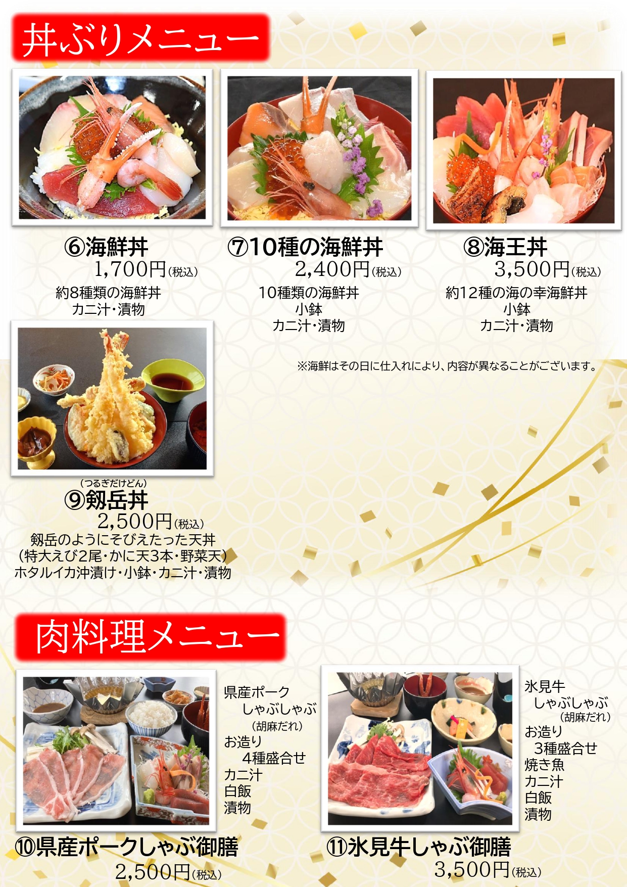●魚料理は漁獲量により、内容が変わることがございます。